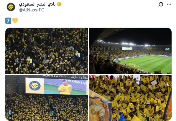 利雅得胜利也力挺自己的队长,他们社媒晒出了球迷声援C罗的照片:7️⃣💛
