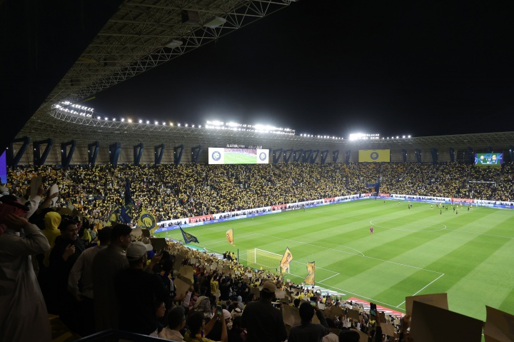 02月07日讯 沙特联第21轮,利雅得胜利对阵吉达联合。比赛第7分钟,胜利球迷全场高举C罗的7号声援队长。